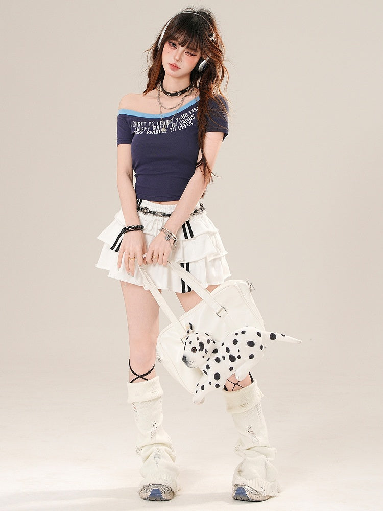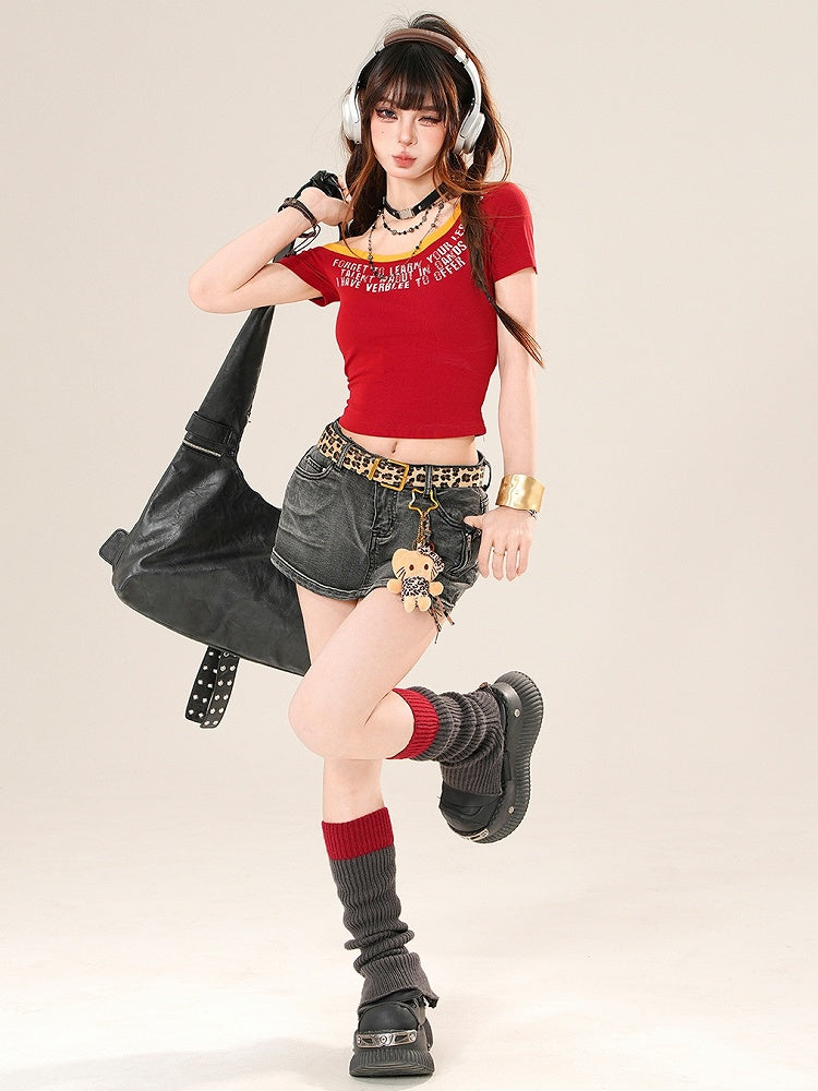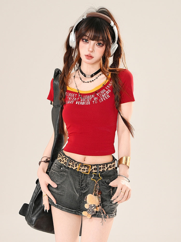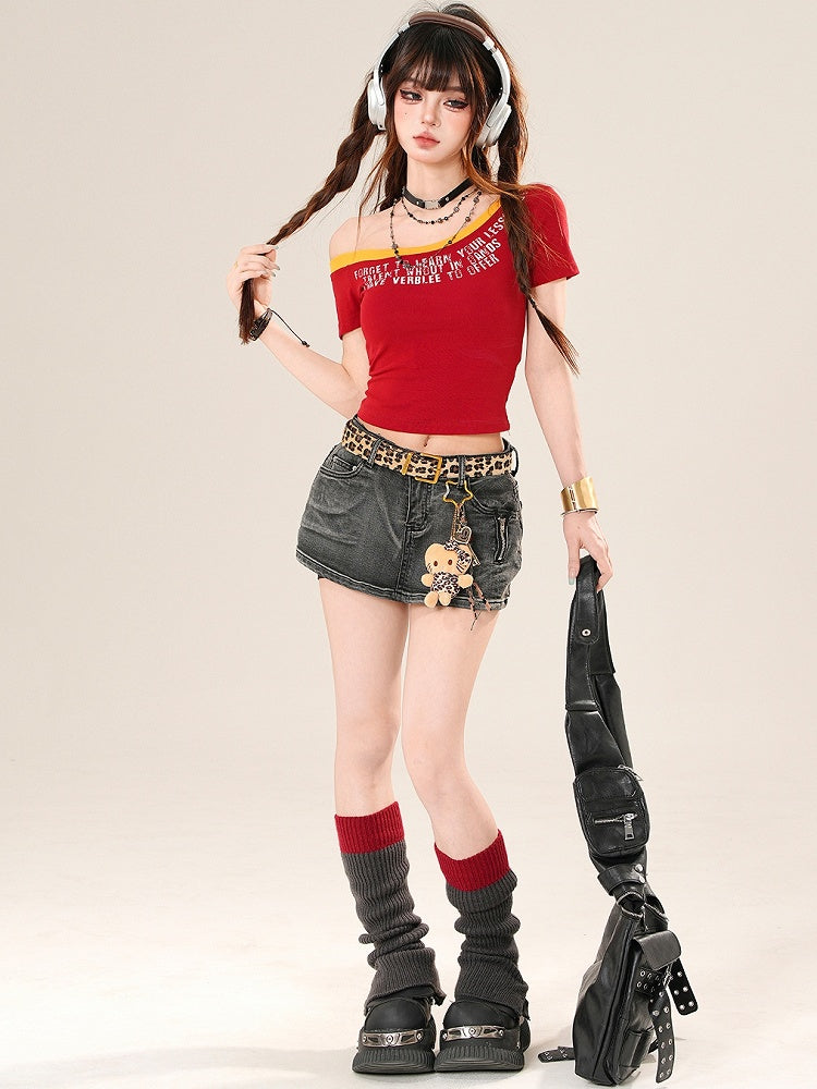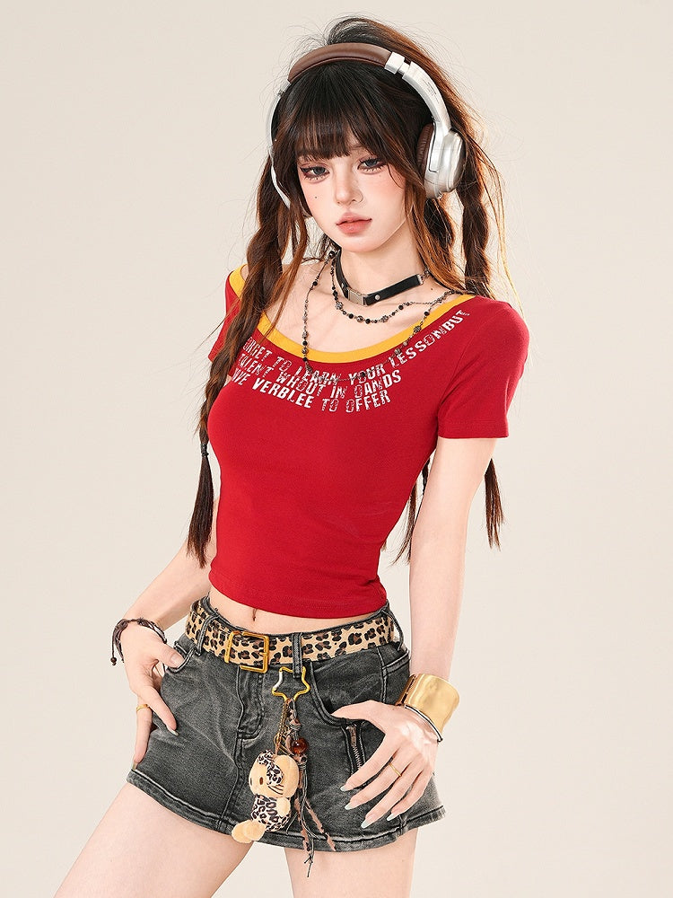 Blue/Red Bittersweet Glamorous Asymmetrical Neckline Letter Print T-shirt