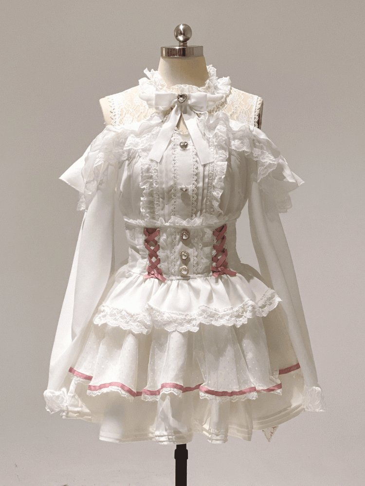 ● Crystal Embellished Buttons / Cutout Shoulder / Lace Trim / Pleating Details / Ruffle Trim