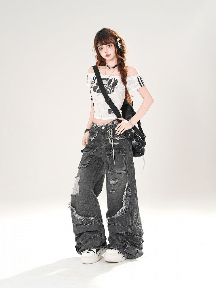 Red/Black Number Print Off-the-shoulder Neckline Slim-fitting T-shirt