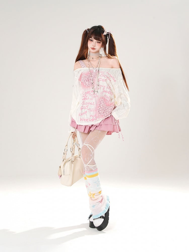 Pink Plaid Butterfly Appliques Black/White Off-the-shoulder Distressed Holes Coverup