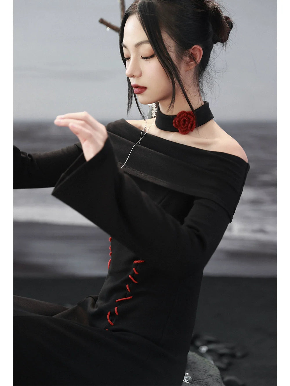 This dress features an off-the-shoulder design, slim, dark color, and draping for a cute and flattering look. Perfect for any occasion, this dress will keep you looking stylish and chic.