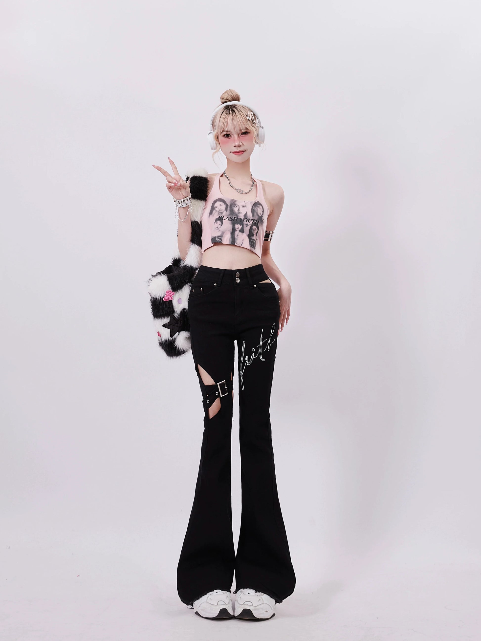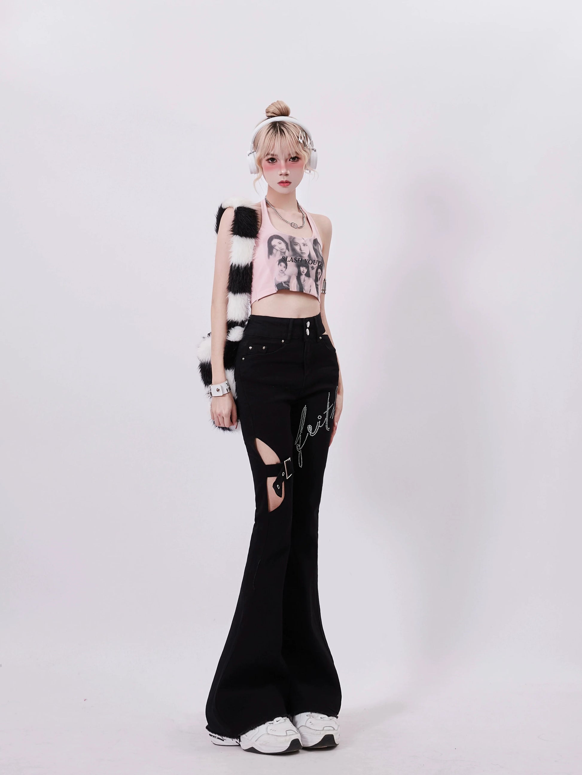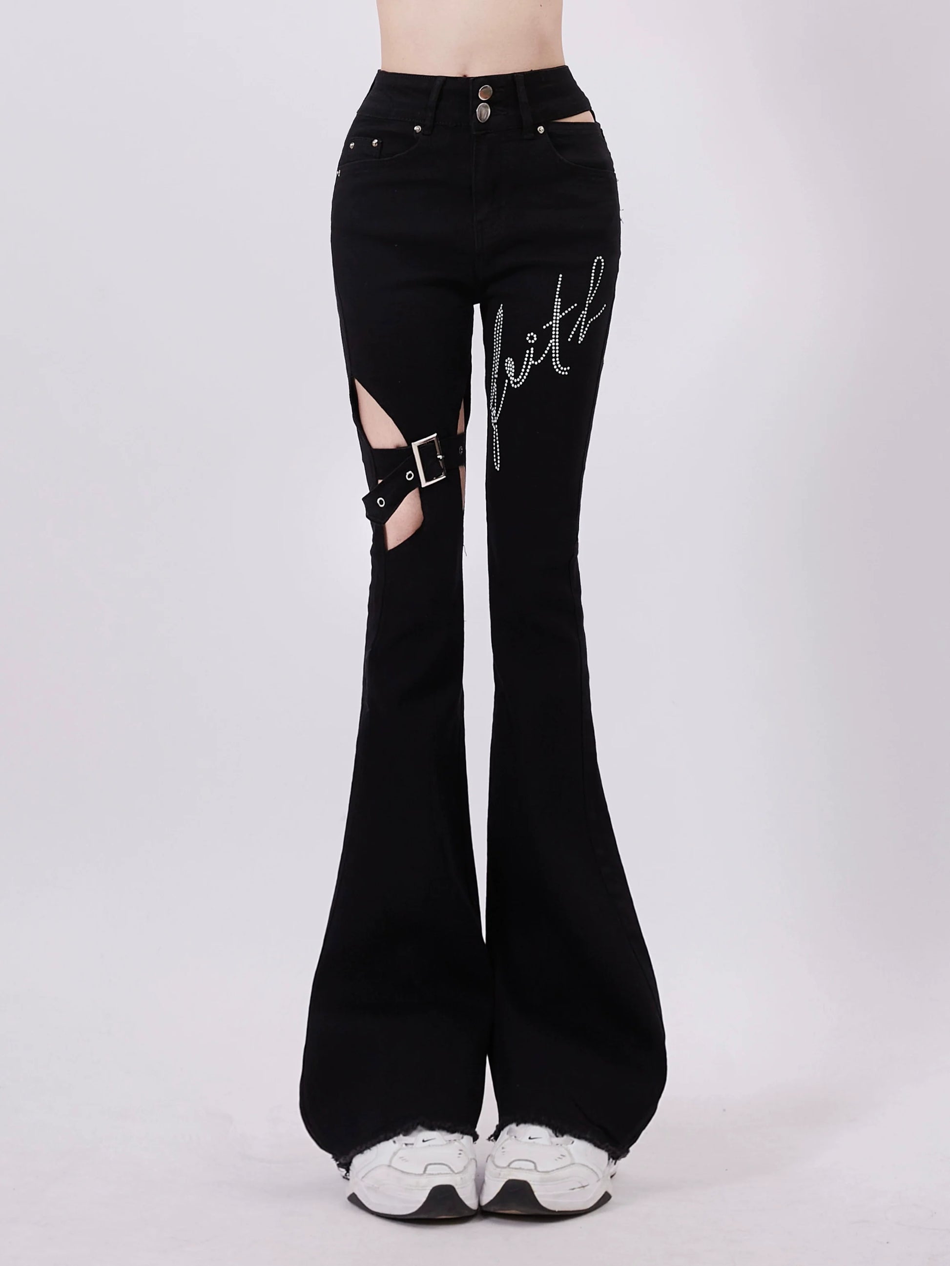 Adorable and stylish Open Pants Belt Dark Design Flared. Effortlessly accentuate your curves with its flattering flared cut. Perfect for any occasion, these pants are a must-have addition to your wardrobe.