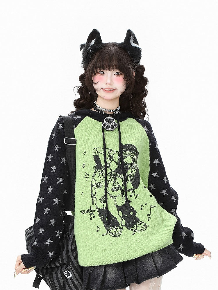 Orange Pink/Green Daily Kawaii Sweater - Cartoon Girl and Star Pattern & Drawstring Hood