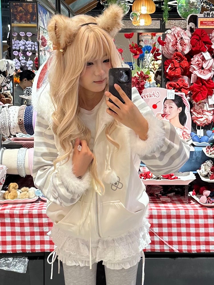 White & Gray Otaku Moe Hooded Jacket - Kitten Embroidery, Pompon Charm & Plush Trim with Stripes