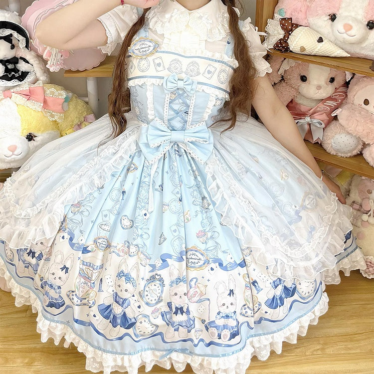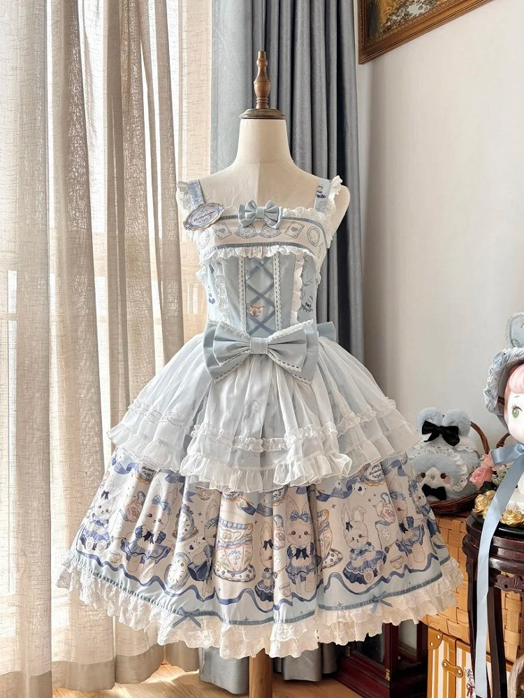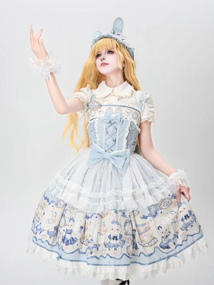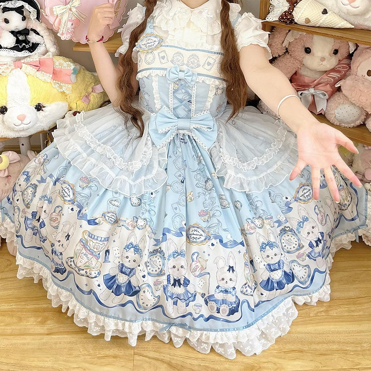 Blue and White Old School Lolita Fashion Dress Bowknot Detais JSK Set
