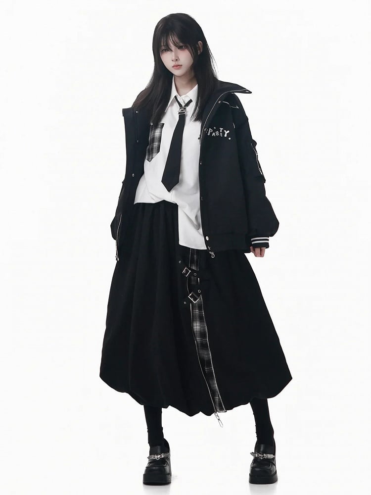 Black Tea Length Bubble Skirt with Plaid Patchwork and Buckle Strap Detail