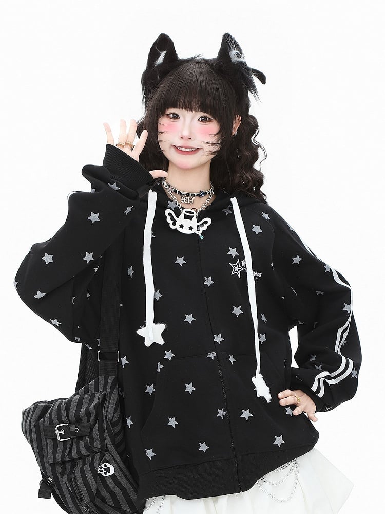 Black/White Kawaii Hoodie Jacket with Stripe Pattern, Star Accents & Drawstring Hood