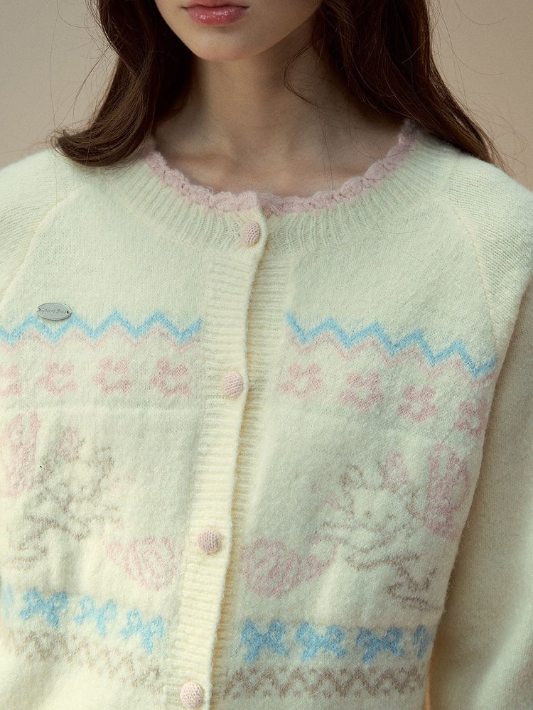 Beige Vintage Knit Sweater with Cat Pattern Design