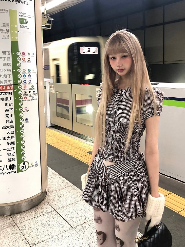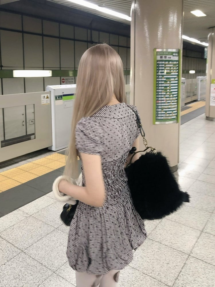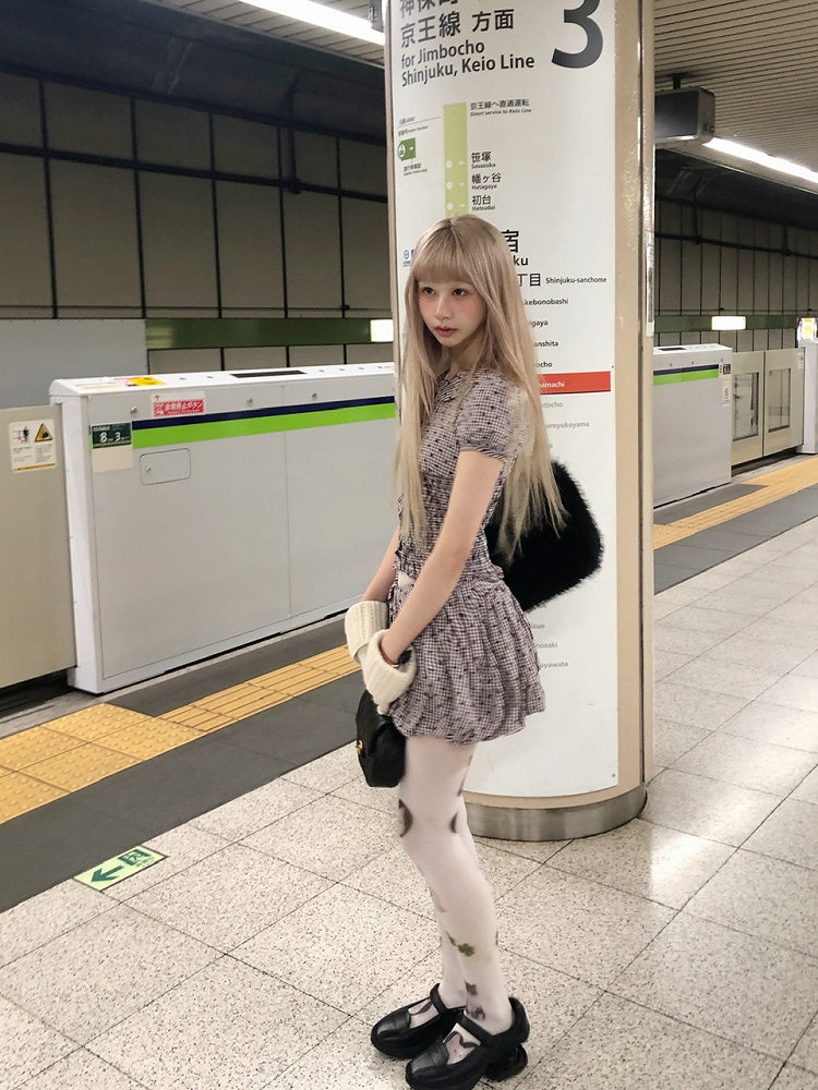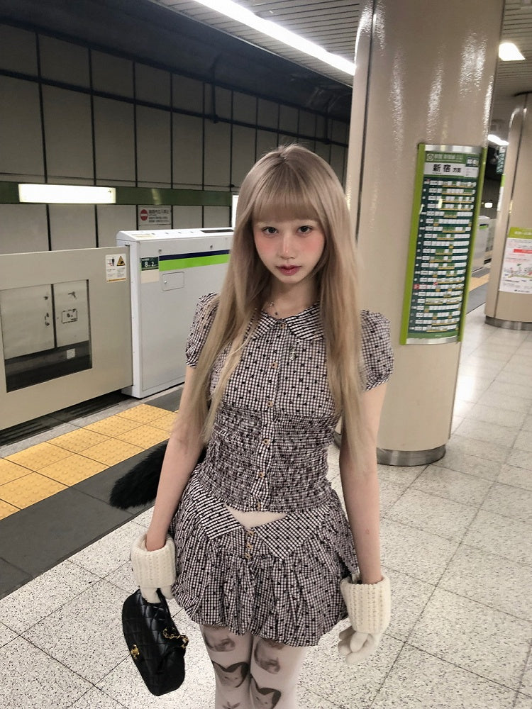 Plaid Floral Pattern Short Puff Sleeve Blouse with Peter Pan Collar