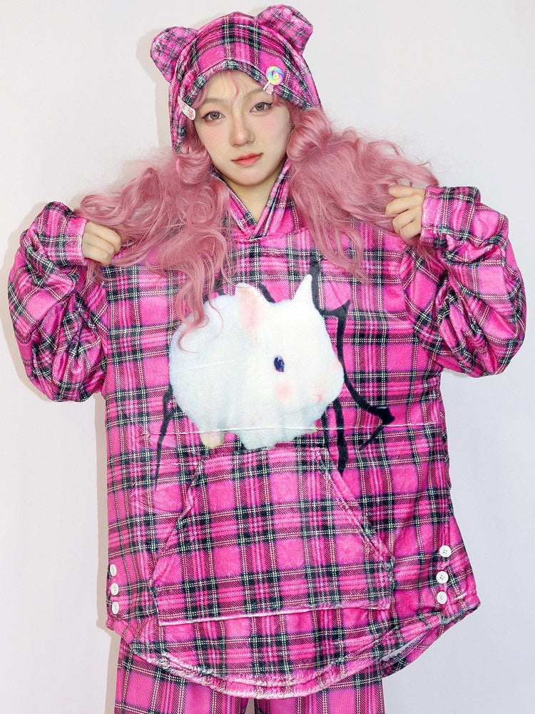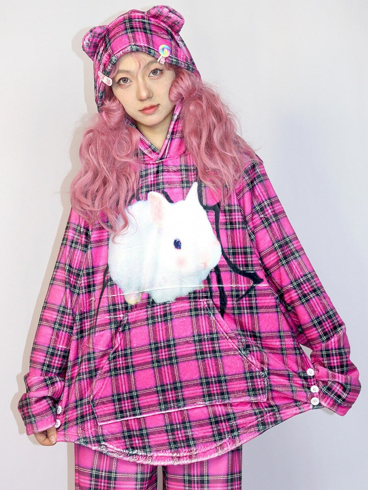 Rose Red Gyaru Fashion Oversized Bunny Print Plaid Pattern Hoodie