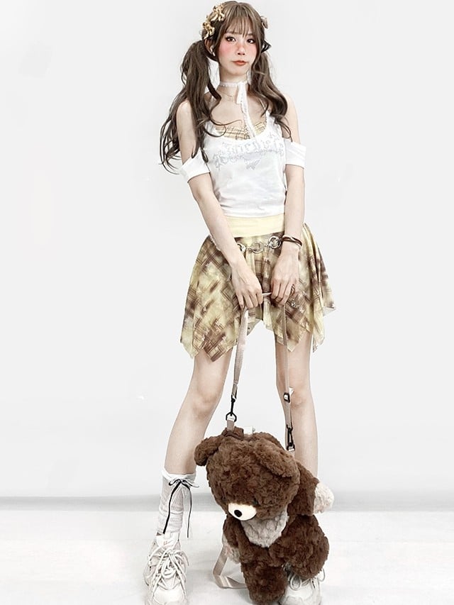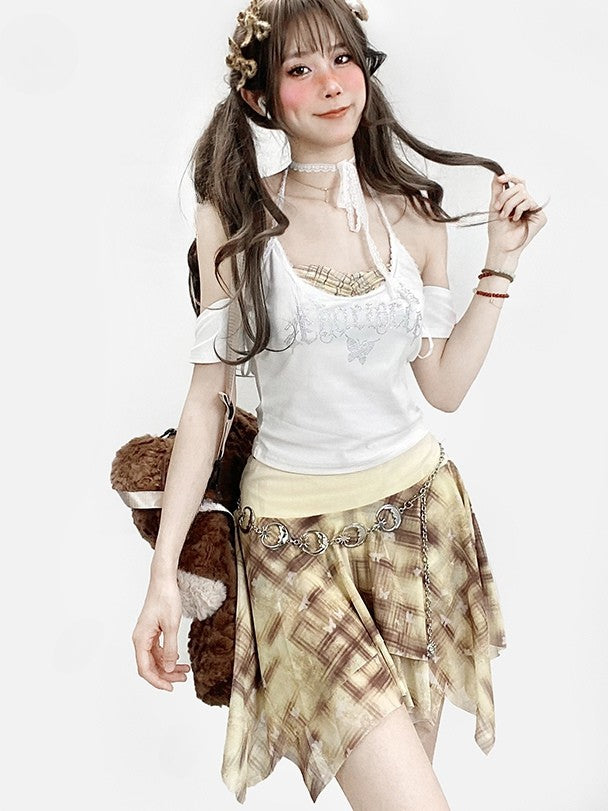 Pattern Rhinestone Plaid Neck Glamorous Top White Y2K Halter