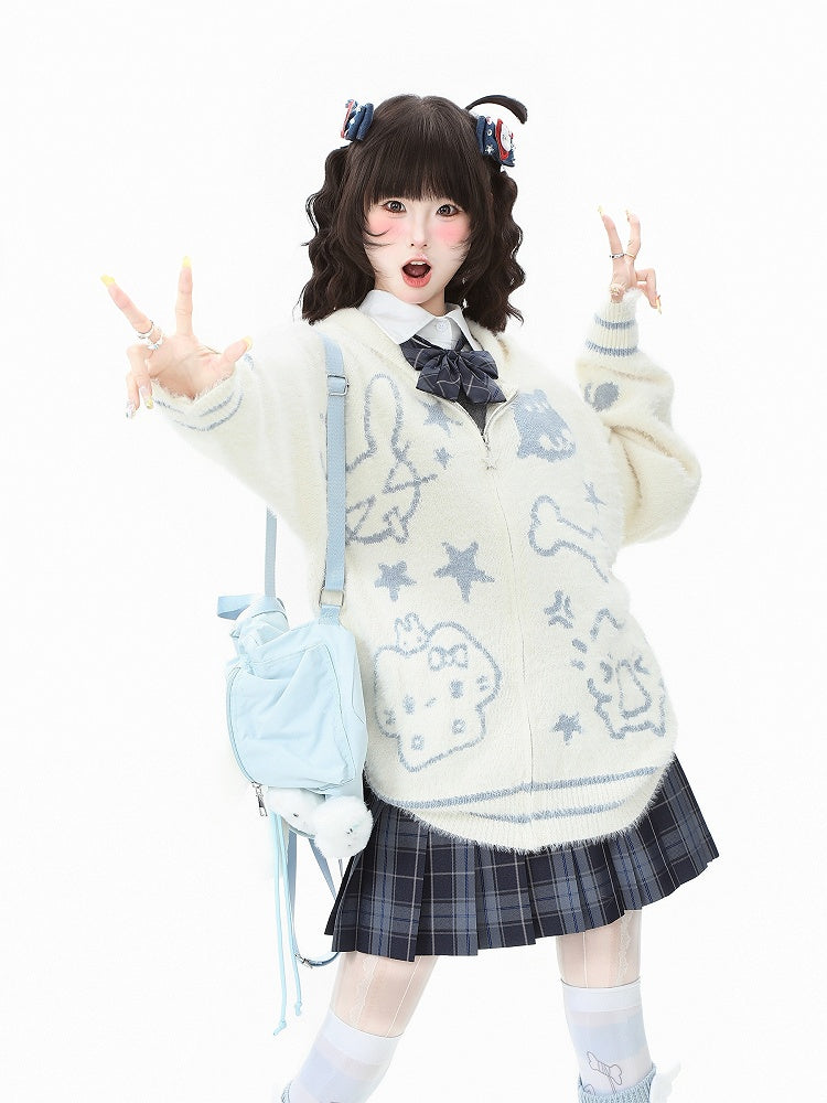 White/Black Cat Ear Hood Plush Jacket with Adorable Animal Patterns