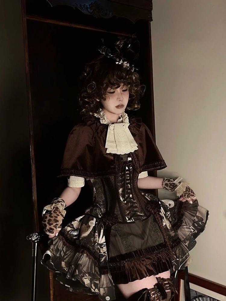 Brown Gothic Lolita Boned Corset Short Dress with Ruffles and Shell Pearl Print Print