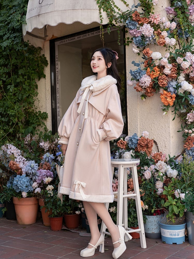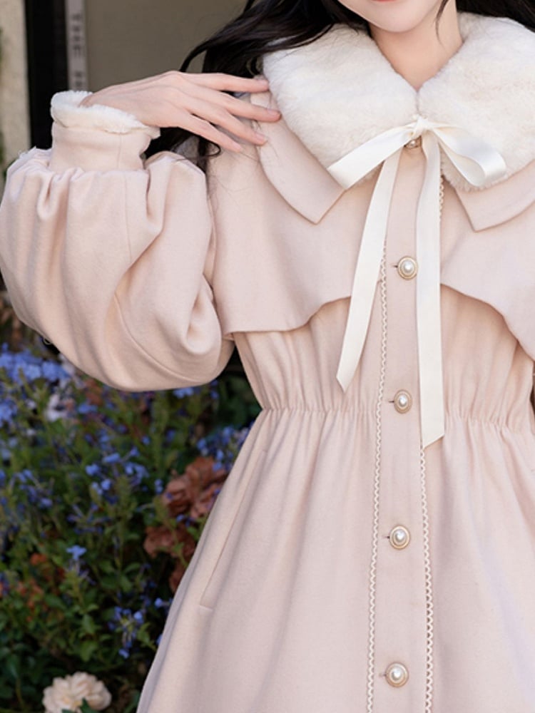 Pink Regular/Padded Coat with Detachable Plush Peter Pan Collar