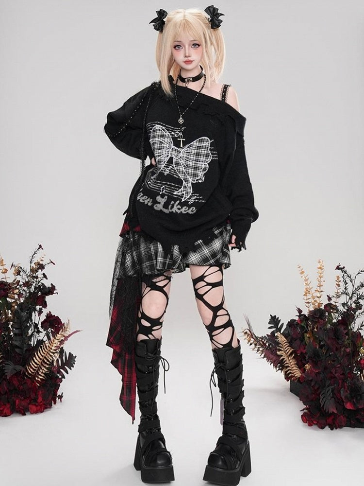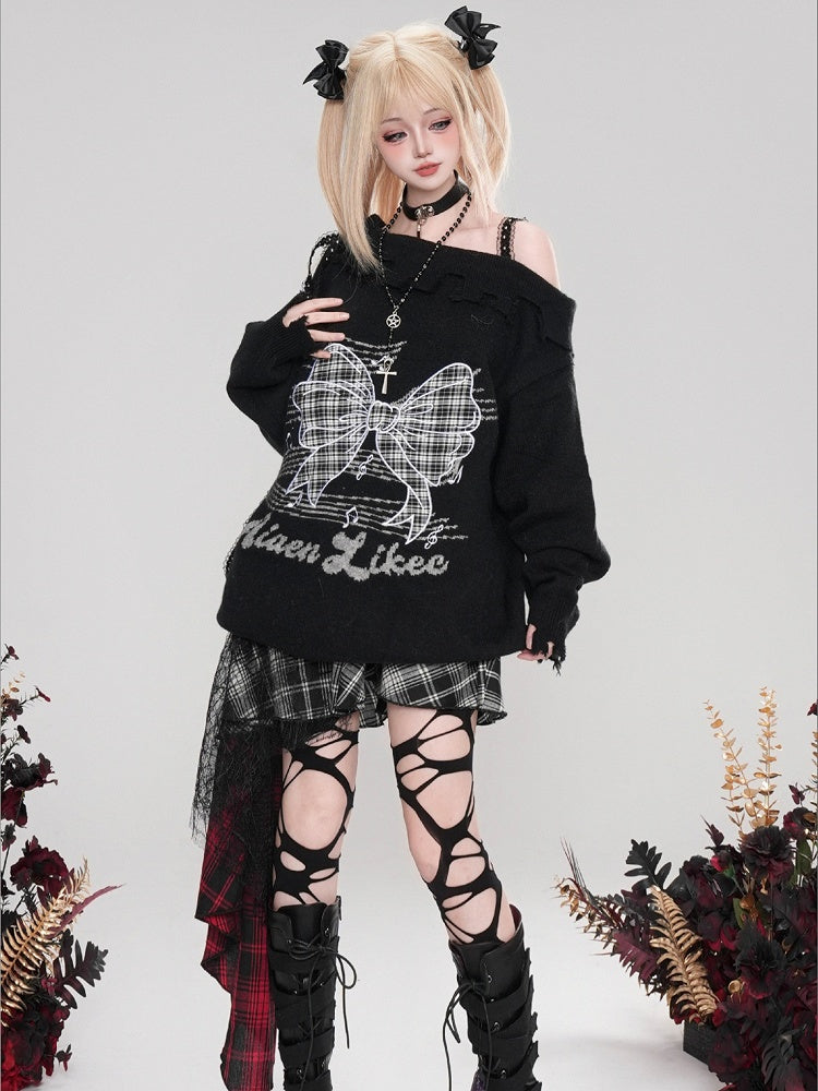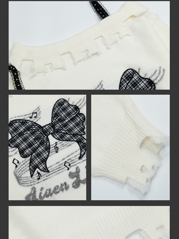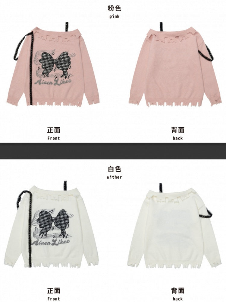 Pink/Black/White Bowknot Applique Asymmetrical Neckline Sweater Distress Trim