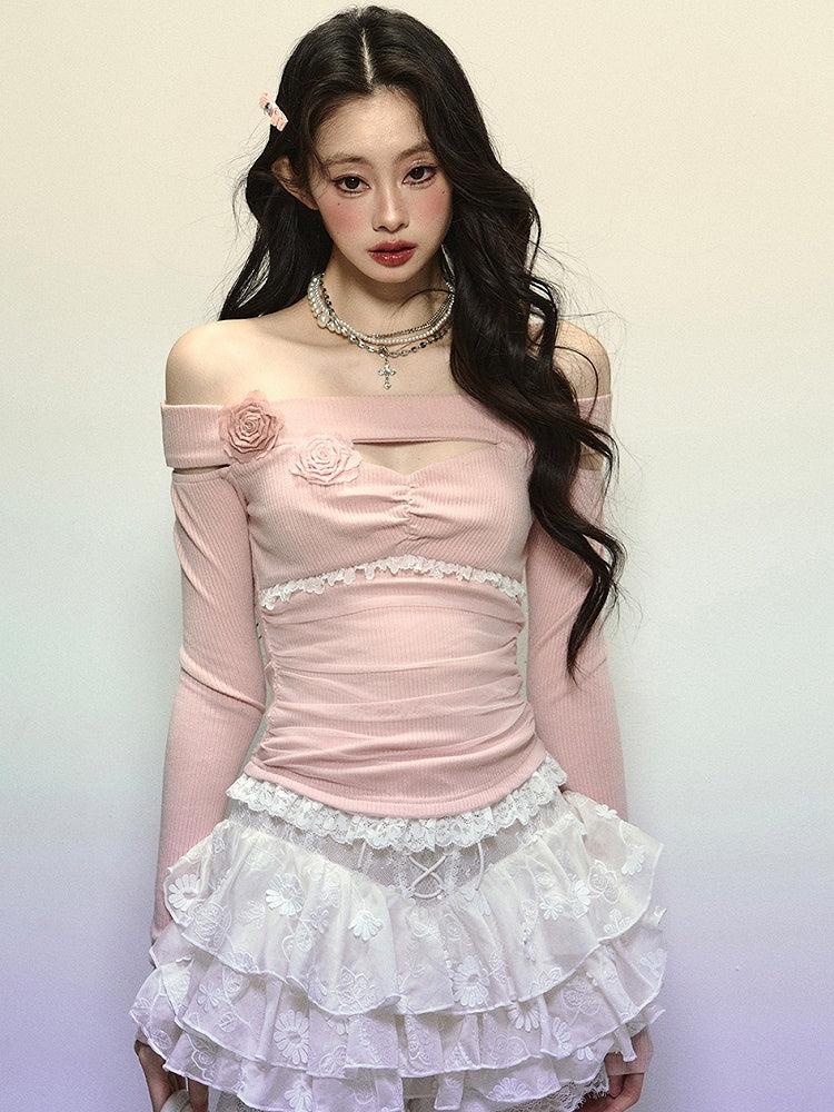 Pink Floral Design Off-the-shoulder Neckline Knit Top with Cutout Detail