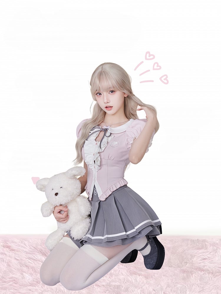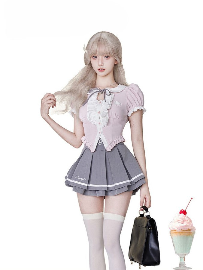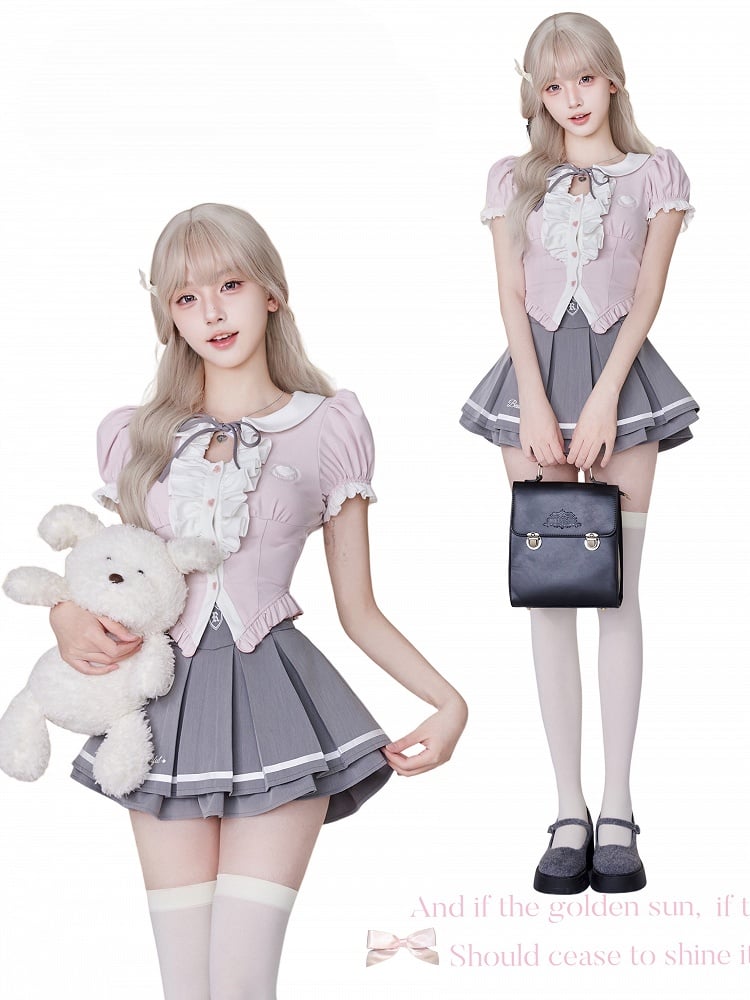 Pink Peter Pan Collar Puff Sleeve Blouse with Ruffle Trim and Bow Tie