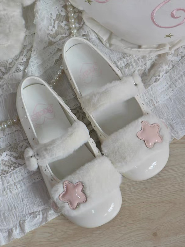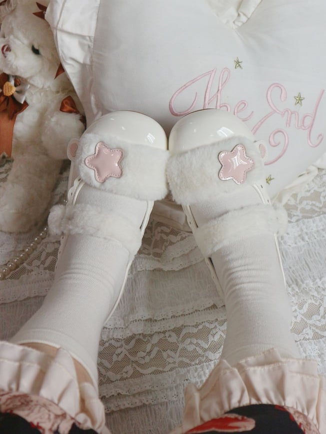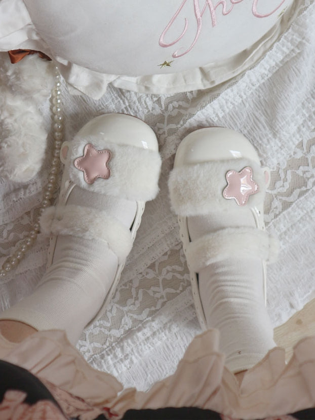 Pink Star Accent, Plush Strap & Snap Button Design Beige Sweet PU Flat Shoes