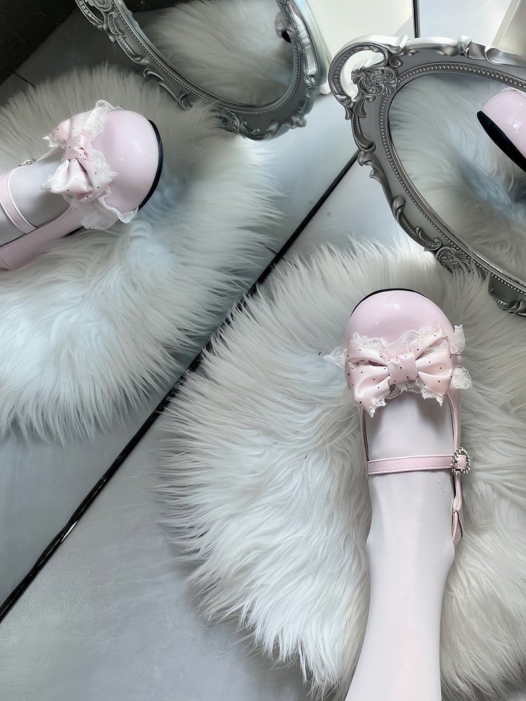 Pink Sweet Lolita Round Toe Flats - Polka Dot Bow with Lace Trim & Crystal Heart Snap