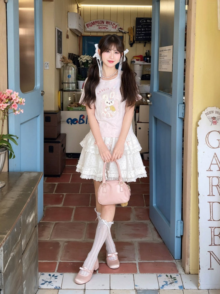 Pink Yume Adorable T-Shirt Bunny Applique Round Neck Kawaii