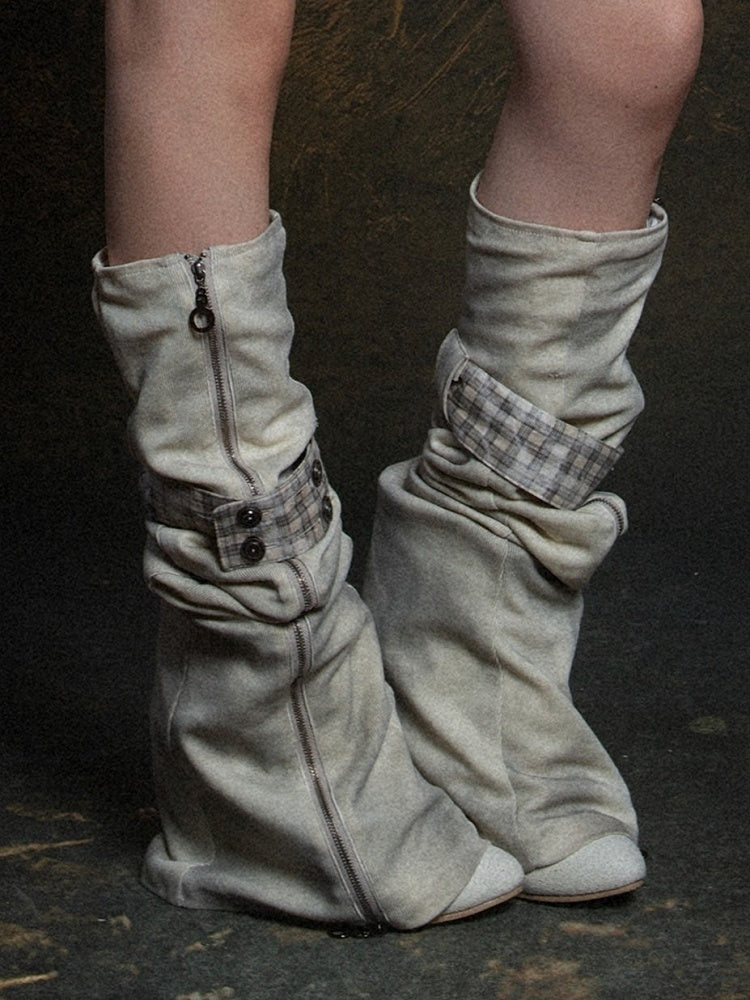 Light Gray Punk Leg Warmers with Vertical Zipper & Plaid Button Strap