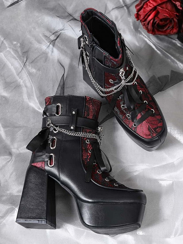 Removable Chain Decor & Multi Fastening System Black & Red Platform High Block Heel Boots in Gothic Style