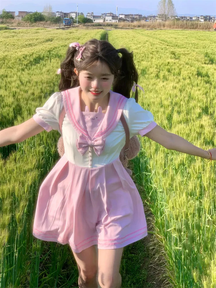 Pleat Bowknot Ears Bunny Collar Sailor Dress Pink Cute and White Box Skirt