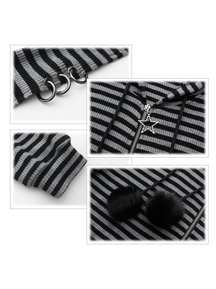 Plus Black Size Drawstrings Pompon Jacket Hoodie Stripes with Bunny Gray