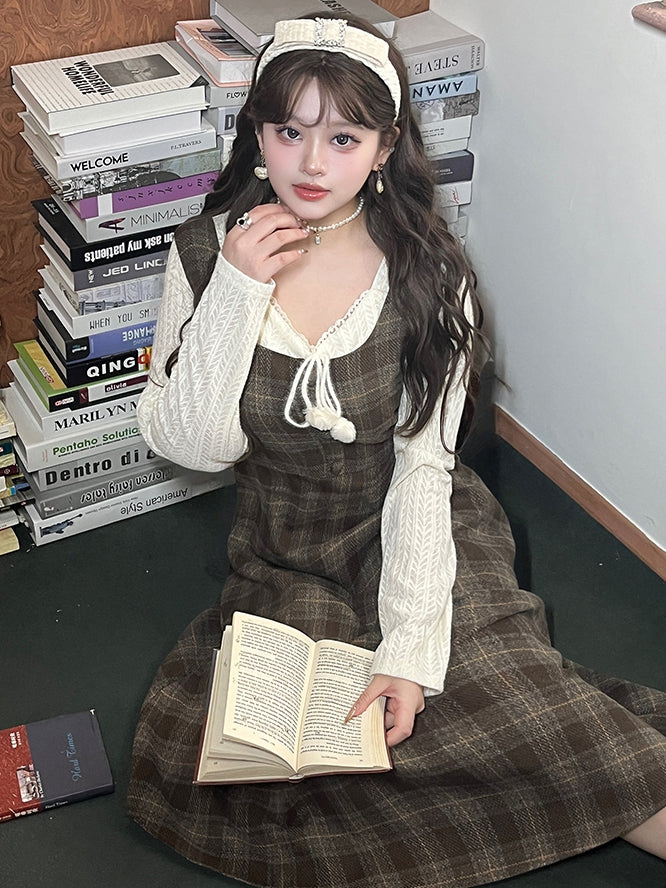 Plus Size Brown High Waist Plaid Pattern Woolen Overall Dress