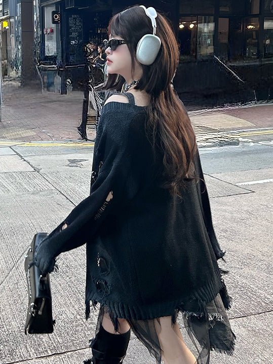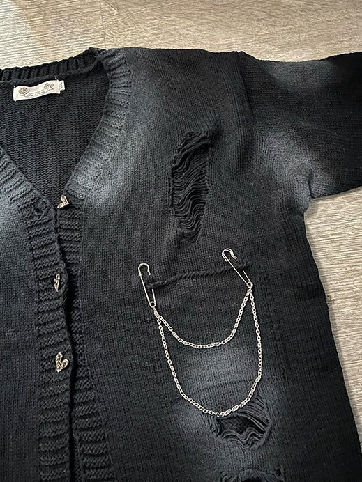 Plus Size Dark Grey Y2K Distressed Holes Loose Cardigan