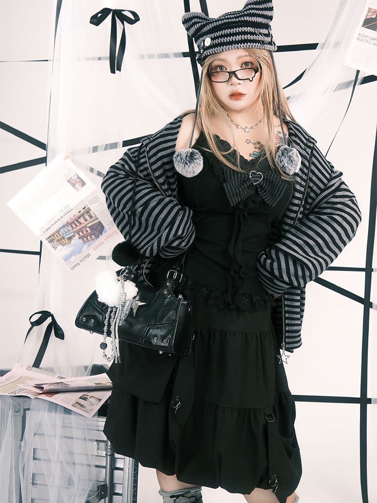 Plus Size Black Lace-trimmed Cami Top with Heart Buckle Striped Bow & Cascading Ruffles