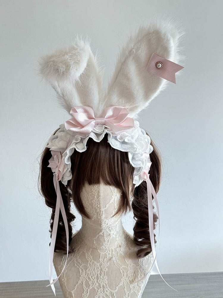 Plush Ear Lolita Striped Bunny Blue/Pink with Hairband Lace Bows Accents and