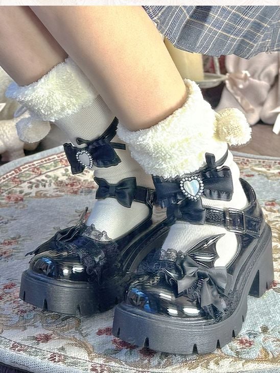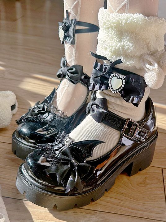 Polished Black Round Toe Bow at Top Lace Trim Block Heel Mary Janes