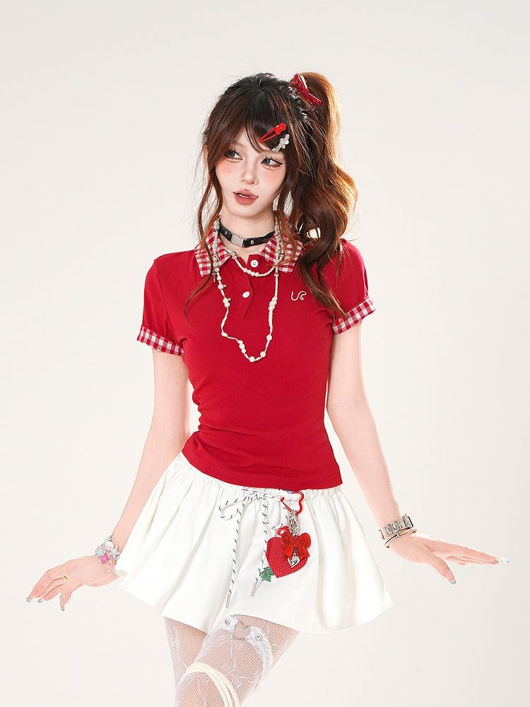 Preppy Style Red/Navy Blue Polo Collar Slim-fitting T-shirt