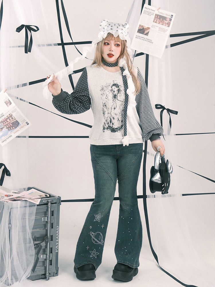Plus Size Y2K White Anime Girl Print Top with Striped & Polka Dot Sleeve