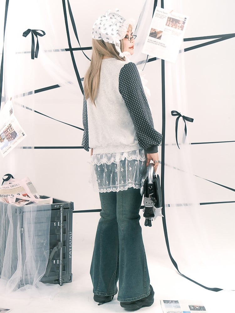 Print Anime with Girl Polka Size Striped Y2K Sleeve White Top Plus Dot