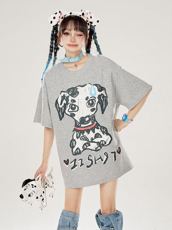 This adorable Dalmatian-print t-shirt in a loose, gray fit is perfect for any dog lover! Made with soft and breathable fabric, it's both stylish and comfortable. Show off your love for these spotted cuties with this must-have shirt.