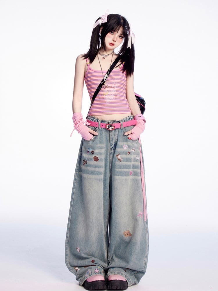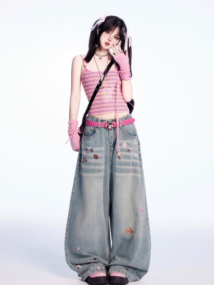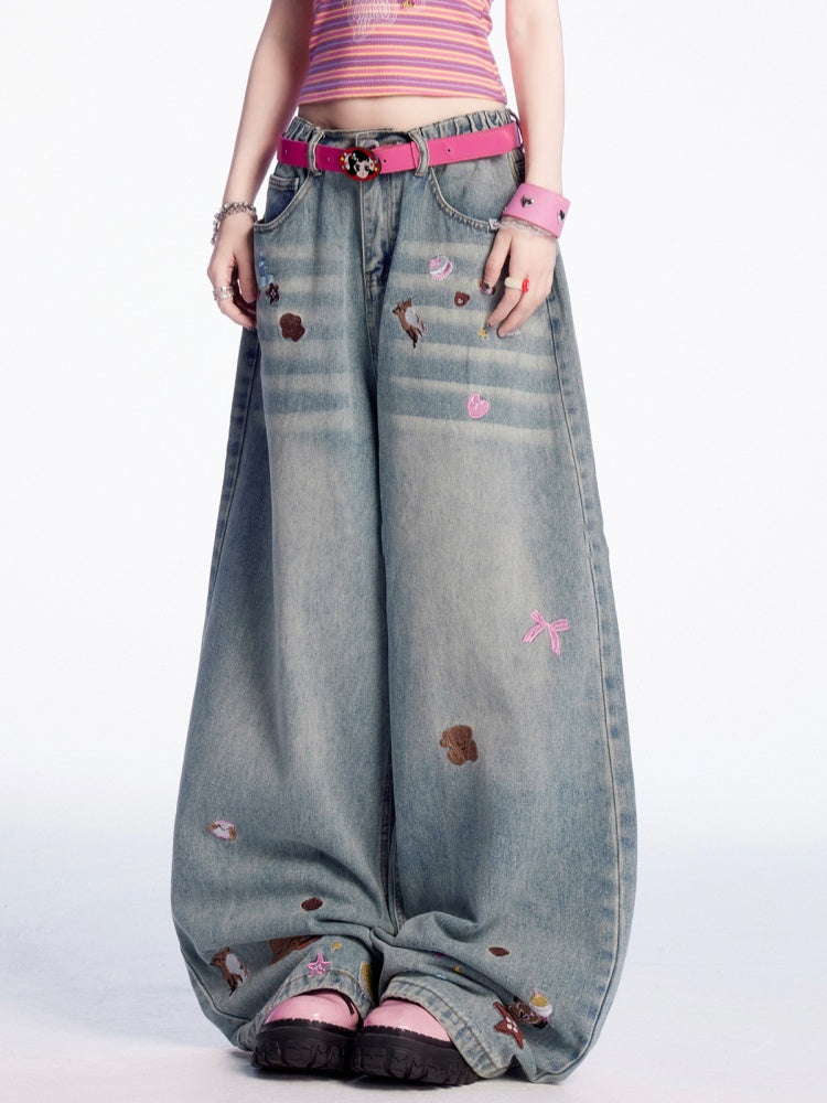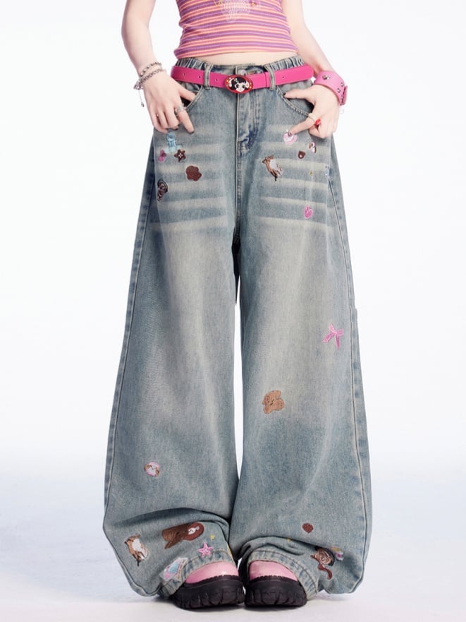 Vintage Cartoon Sticker Print Light Blue Low Waist Faded Wash Wide-leg Jeans