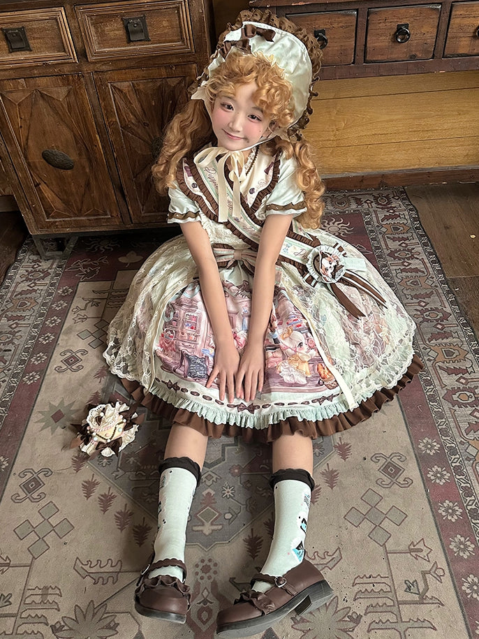 Print Lolita Coffee Overlay Green Puppy's Sweet House Detachable with Dress