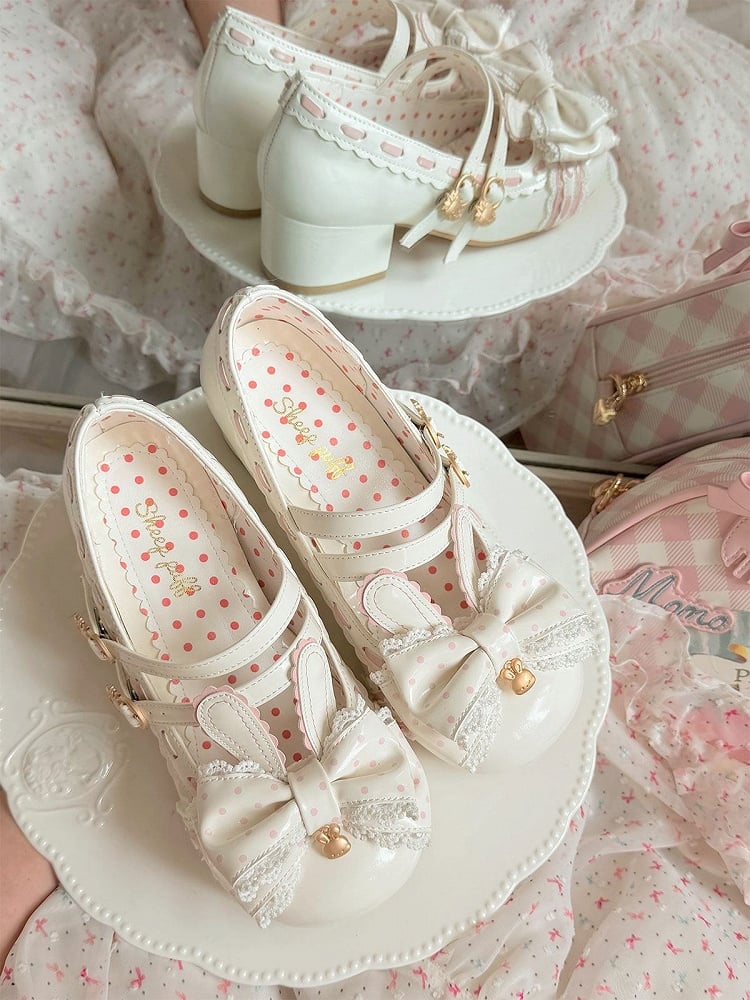 PU Bow White Heeled Lolita Bunny 4.2cm Shoes Sweet Decor in Strawberry - Buckle