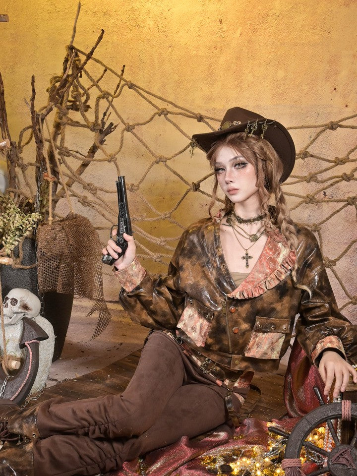 Steampunk Brown Suede Pants with Detachable PU Suspenders & Orange Lace V-Waistband