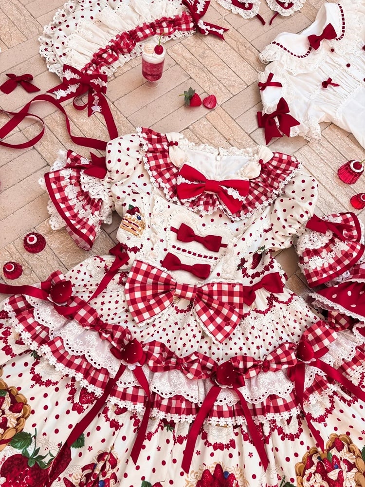 Red & White Strawberry Cake Print Puff Sleeves Sweet Lolita Dress with Ruffle Hem