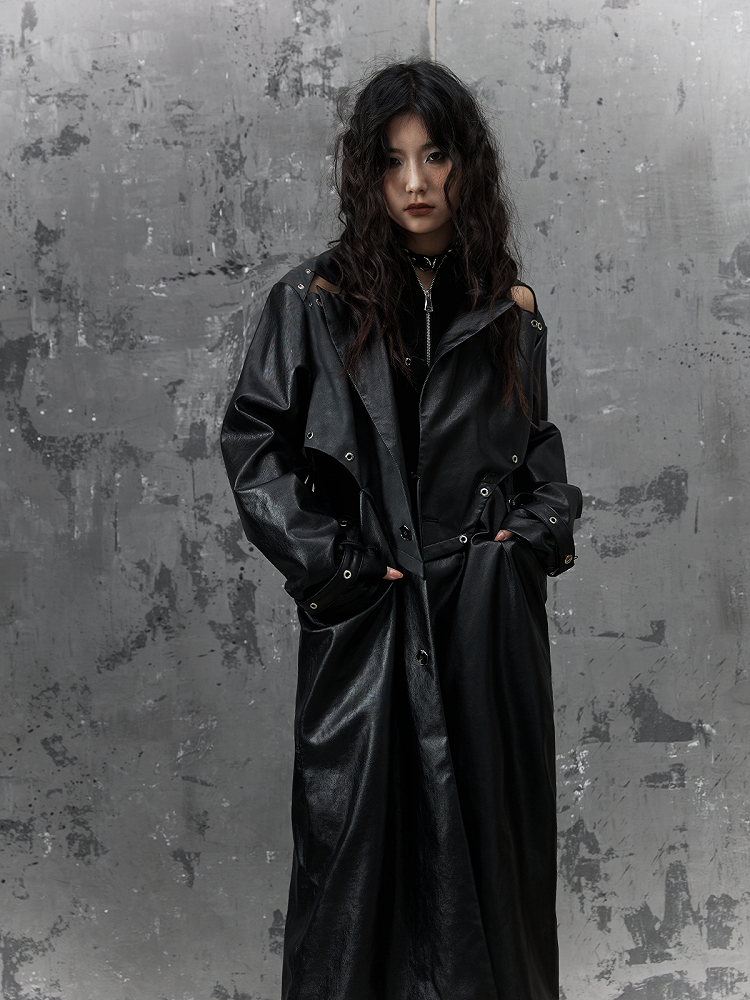 Punk Patchwork & Cutout Design PU Long Coat - Buckle Cuffs