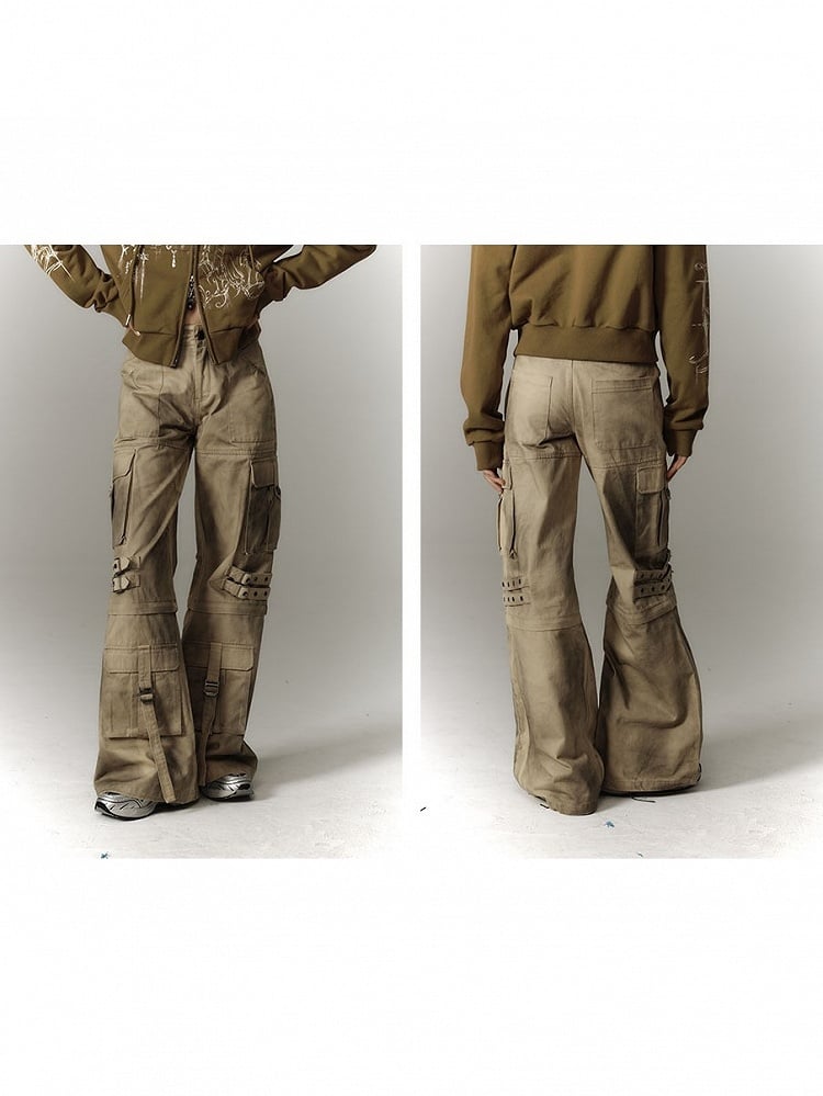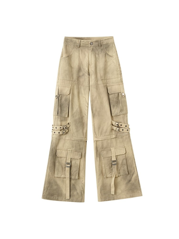 Punk Convertible Cargo Washed Capris Multi-Pockets Fashion Yellow Millard Pants with