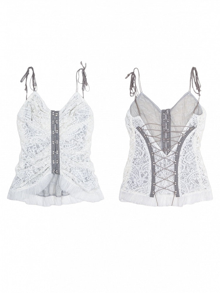 Punk Crisscross Cami Embroidered Floral with Lacing Top Beige Back Gothic