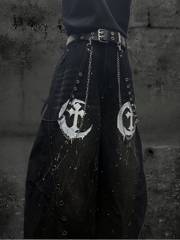 Black Punk Rock Distressed Design Wide-leg Jeans - Moon Pattern & Cross Patch with Eyelet Detail