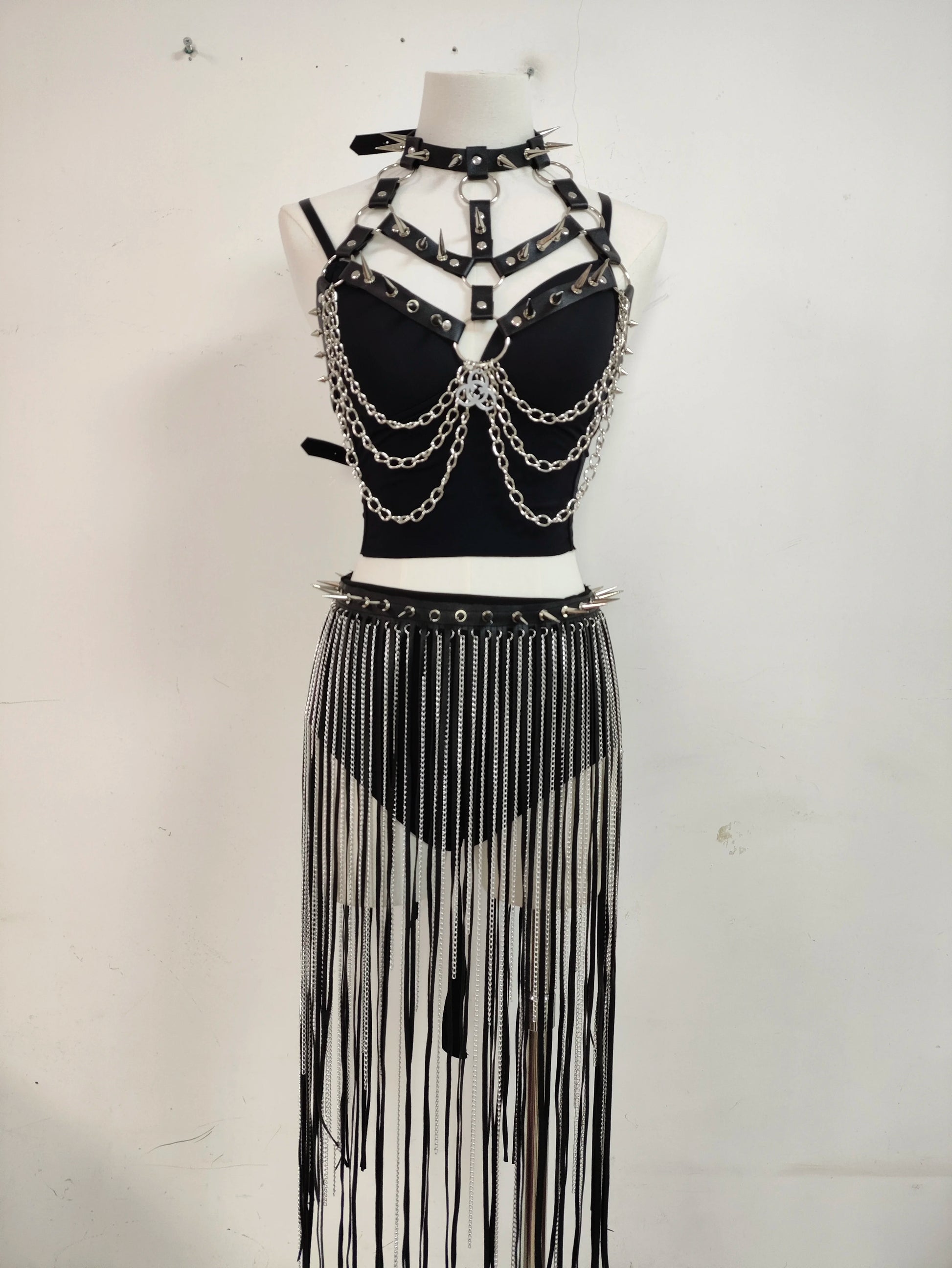 Unleash your inner rebel with this show-stopping punk ensemble. The edgy leather vest features bold rivet detailing and dramatic chain accents that scream attitude, while the gothic tassel skirt adds a flirty twist to your dark aesthetic. Perfect for making a statement at festivals, nights out, or whenever you're ready to turn heads. Mix bold with playful—because sometimes the best style breaks all the rules.