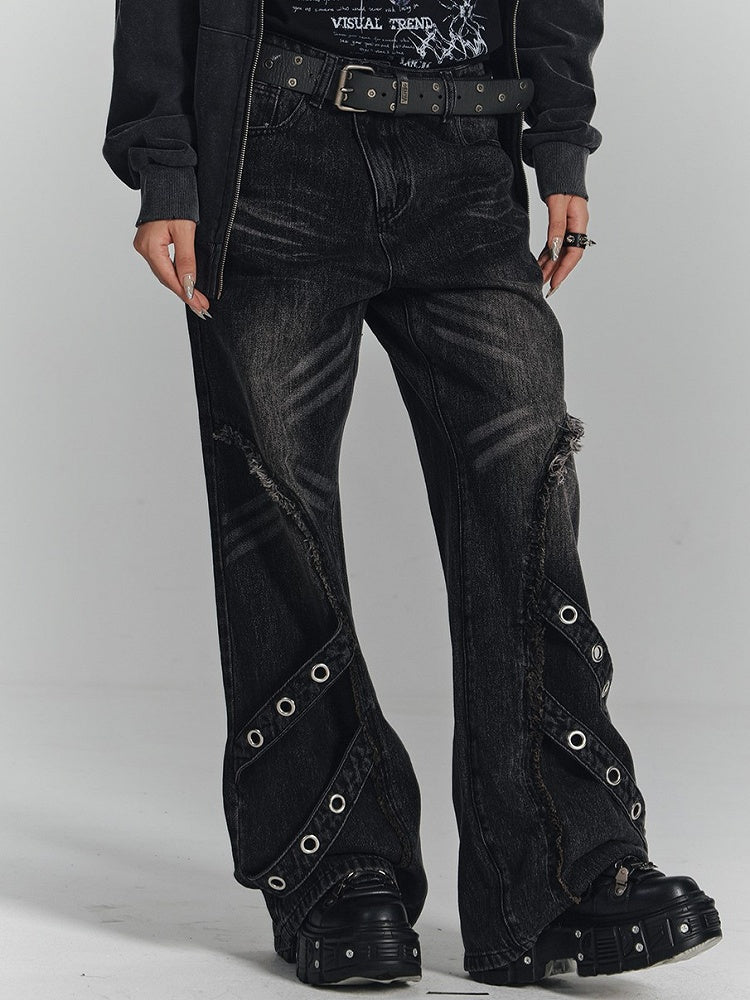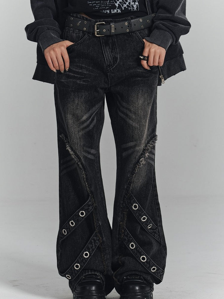 Punk Strips Denim Faded with Jeans Diagonal Raw Black Hem Wash Metal Eyelet