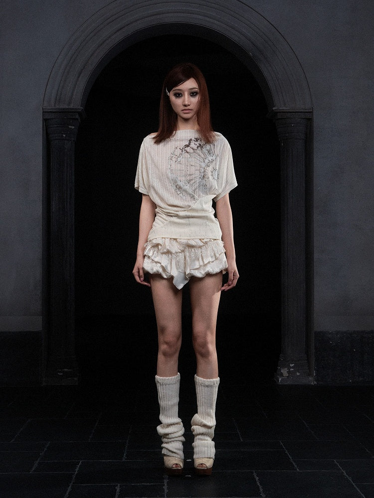 Apricot Semi-Sheer Off-Shoulder Ruched Top with Punk Prints