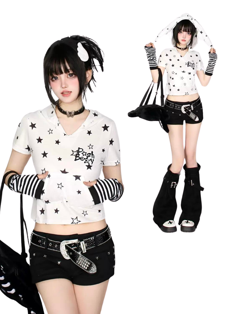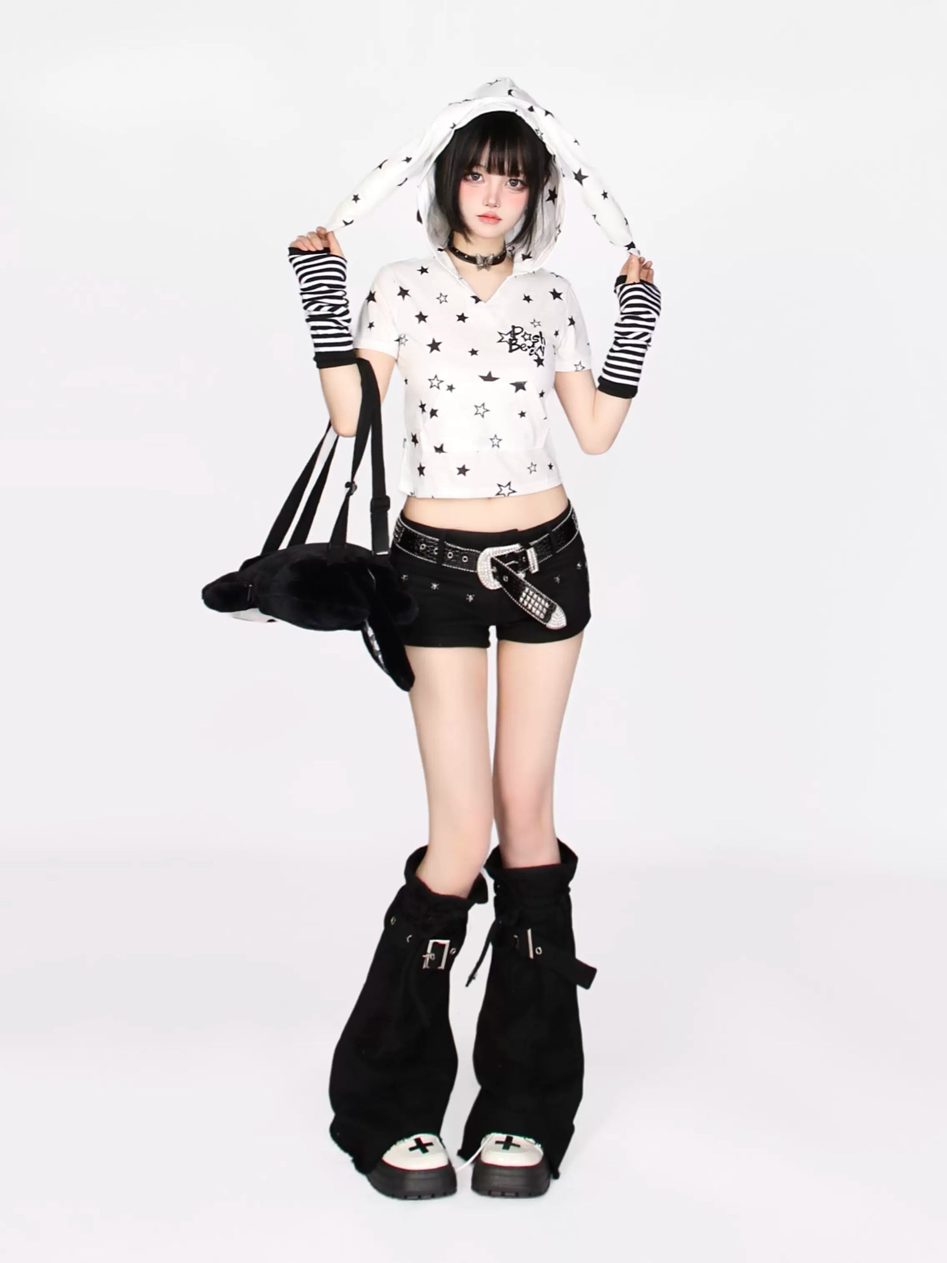 Rabbit Print and T-shirt Foodie with Star Ears Cropped